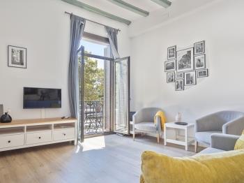L’arredamento dell’appartamento è moderno, con cucina a vista e soggiorno adiacente. La cucina è completamente attrezzata, con frigorifero, lavatrice e microonde. Dispone di una camera da letto con letto matrimoniale e di un ampio bagno. Il soggiorno è dotato di divano, aria condizionata, televisore, connessione Wi-Fi, ferro da stiro e un piccolo balcone alla francese con vista su Barcellona.